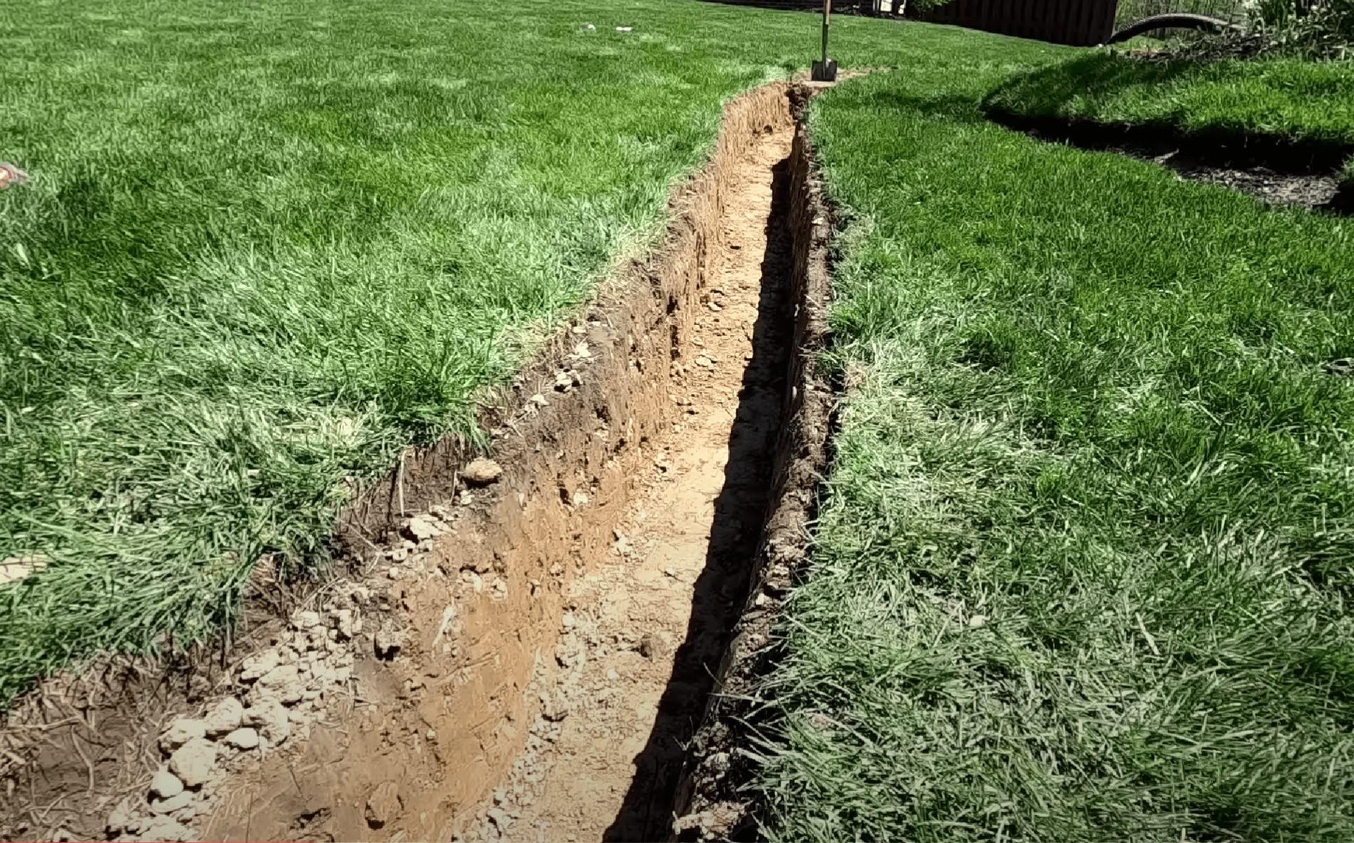 Tranšėja kasama kastuvo arba eskavatoriaus pagalba, jos gylis turi būtu apie 50 cm – 100 cm, plotis apie 50 cm. Tranšėjos dugną išlyginkite plautu smėliu ir suformuokite 1% nuolydį, tą kryptimi, kuria norite, kad teketų vanduo drenažiniame vamzdyje.